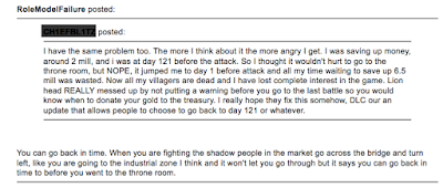 There is a questioning of the system - "should a year be 360 days?" (granted, this should be 365 days, young gamer, unless it is a play on the Xbox360 name). There is an expectation of the duration of the game. I admit to having the same expectation. Why is the game over before the expected time frame?